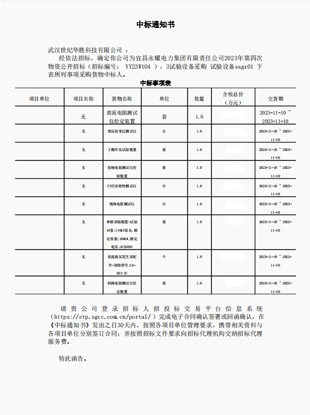 熱烈慶祝武漢世紀(jì)華勝科技有限公司在宜昌永耀電力集團有限責(zé)任公司2023年第四次物資公開招標(biāo)項目中標(biāo)